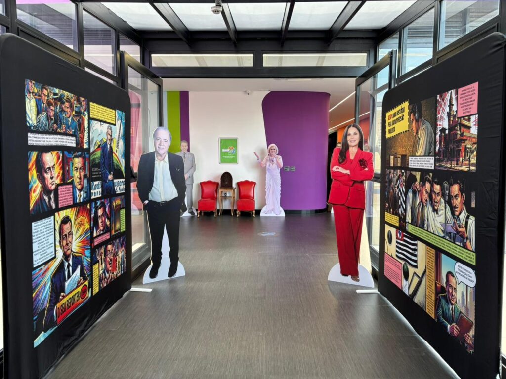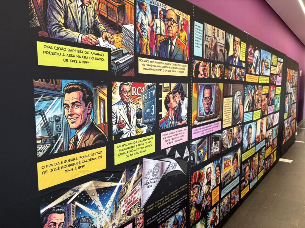 No terceiro andar, a exposição “NO AR – A História do Rádio e TV em São Paulo” oferece uma jornada técnica e cultural. Criada para celebrar o Dia Mundial do Rádio, a mostra utiliza uma estética inspirada em Histórias em Quadrinhos (HQs) para narrar a trajetória da comunicação brasileira desde os anos 1920 até a implementação da TV digital.